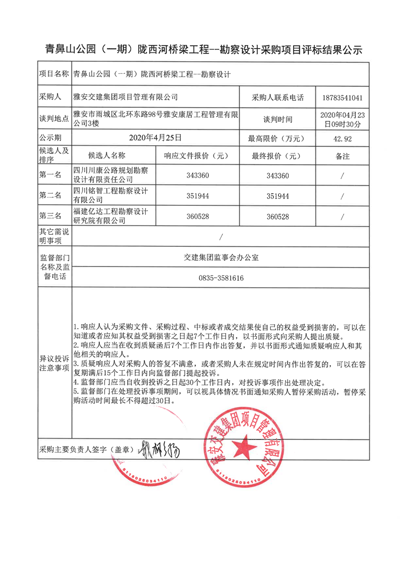 雅安交建集團項目管理有限公司青鼻山公園(一期)隴西河橋梁工程項目勘察設計采購項目評標結(jié)果公示
