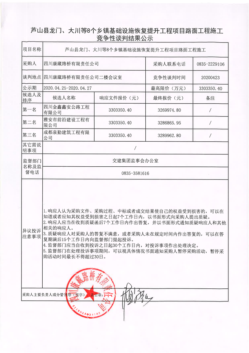 四川康藏路橋有限責(zé)任公司蘆山縣龍門、大川等8個(gè)鄉(xiāng)鎮(zhèn)基礎(chǔ)設(shè)施恢復(fù)提升工程項(xiàng)目路面工程施工競爭性談判結(jié)果公示
