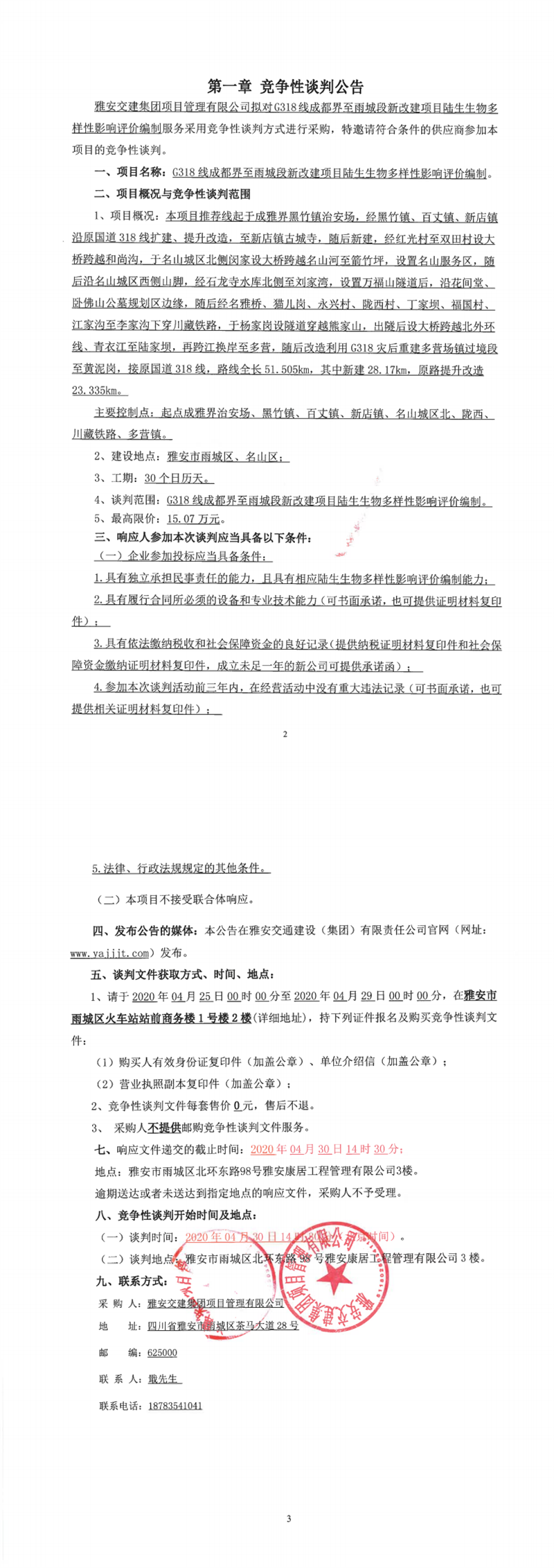 雅安交建集團(tuán)項(xiàng)目管理有限公司G318線成都界至雨城段新改建項(xiàng)目陸生生物多樣性影響評(píng)價(jià)編制競(jìng)爭(zhēng)性談判公告