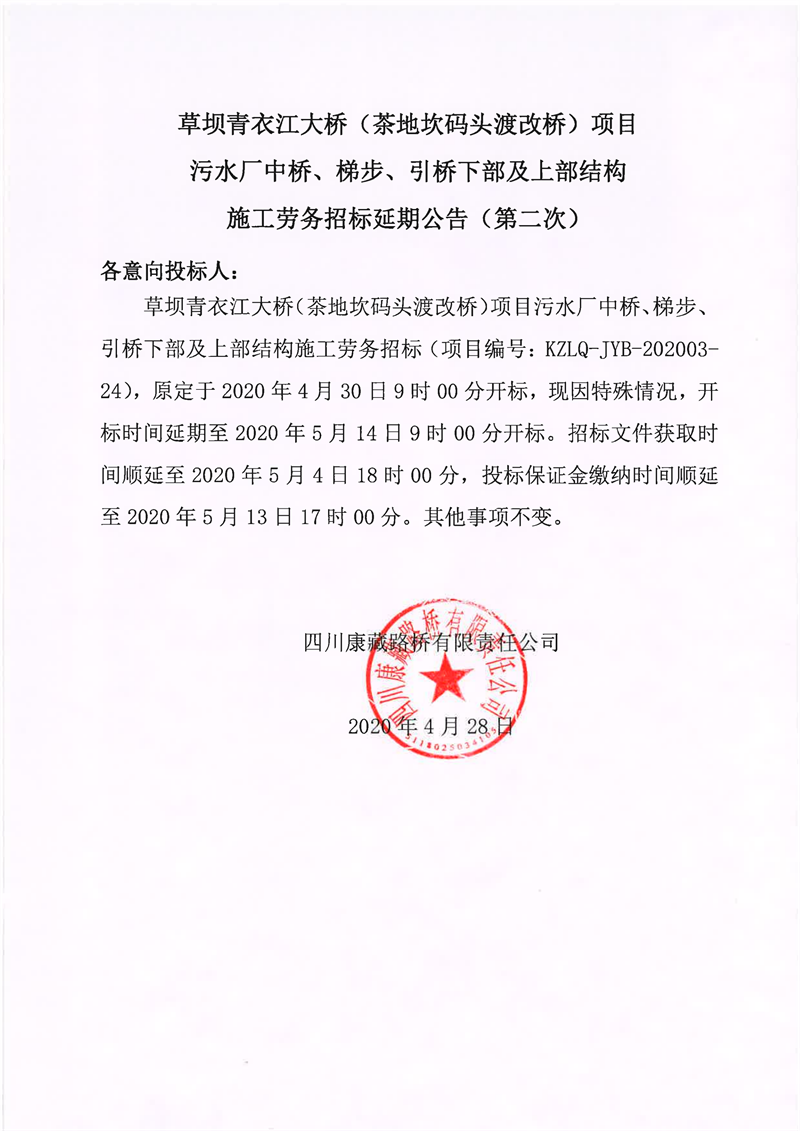 四川康藏路橋有限責(zé)任公司草壩青衣江大橋(茶地坎碼頭渡改橋)項目污水廠中橋、梯步、引橋下部及上部結(jié)構(gòu)施工勞務(wù)招標(biāo)延期公告(第二次)