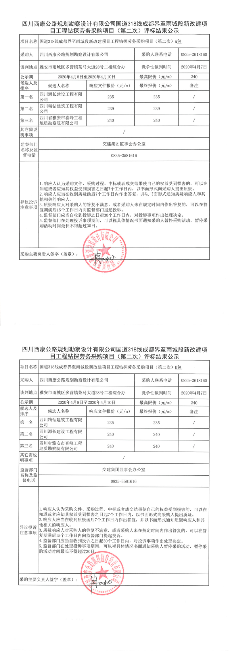 四川西康公路規(guī)劃勘察設(shè)計(jì)有限公司國(guó)道318線成都界至雨城段新改建項(xiàng)目工程鉆探勞務(wù)采購(gòu)項(xiàng)目(第二次)評(píng)標(biāo)結(jié)果公示