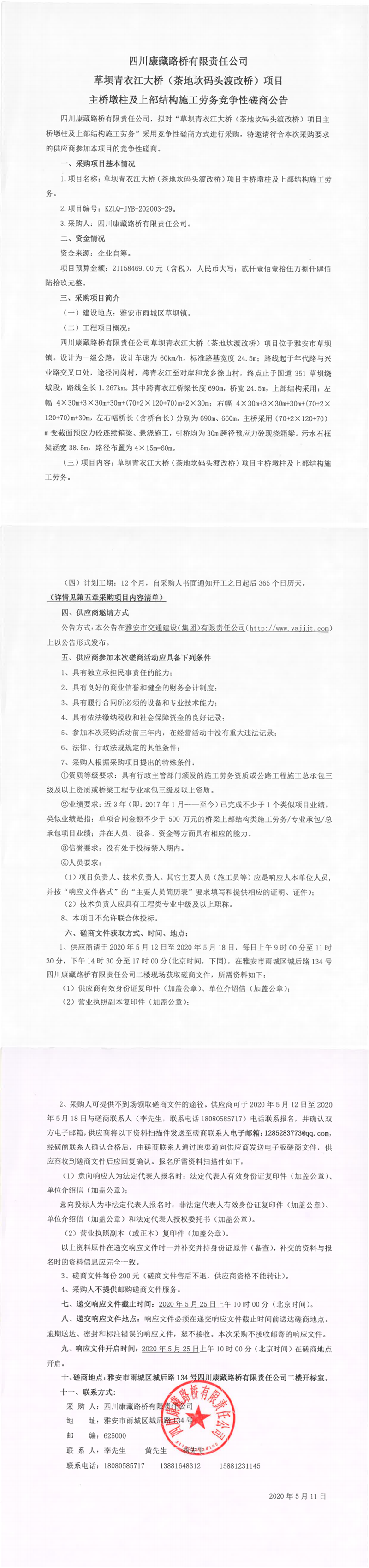四川康藏路橋有限責(zé)任公司草壩青衣江大橋(茶地坎碼頭渡改橋)項(xiàng)目主橋墩柱及上部結(jié)構(gòu)施工勞務(wù)競爭性磋商公告