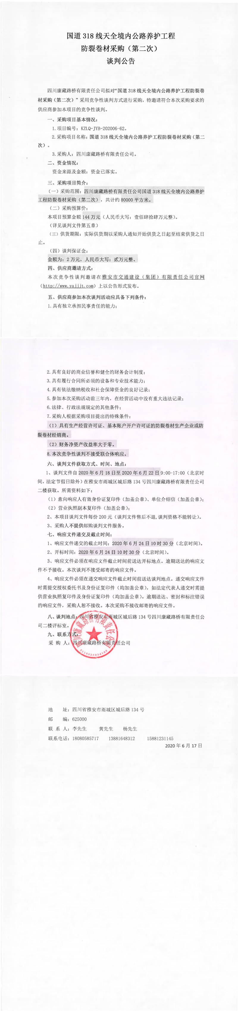四川康藏路橋有限責(zé)任公司國道318線天全境內(nèi)公路養(yǎng)護工程防裂卷材采購(第二次)談判公告