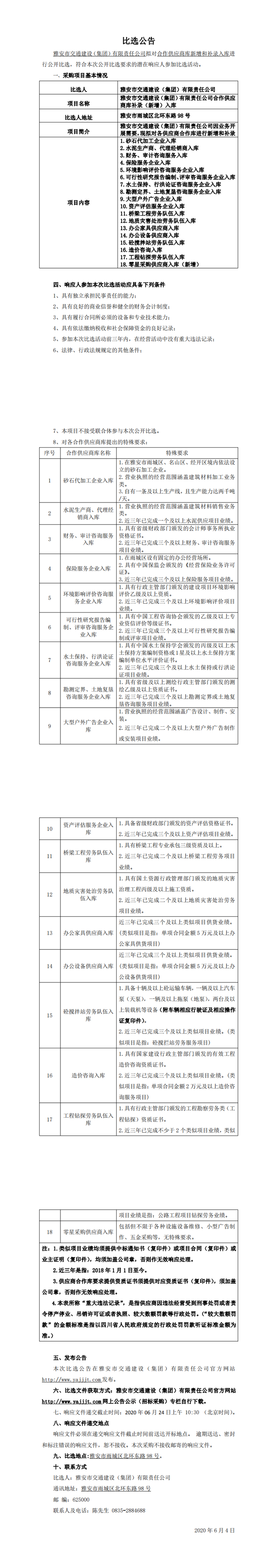 雅安市交通建設(shè)(集團(tuán))有限責(zé)任公司合作供應(yīng)商庫補(bǔ)錄(新增)入庫比選公告