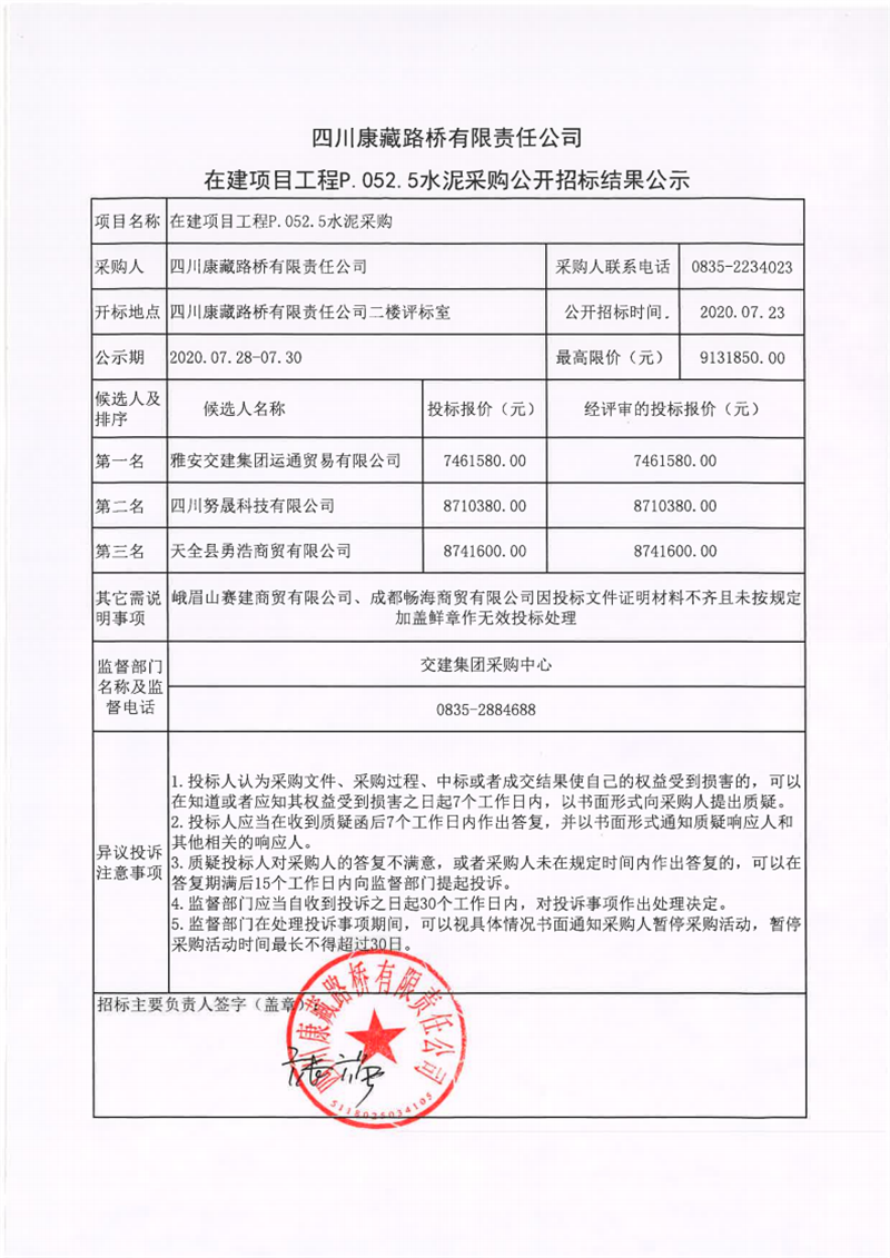 四川康藏路橋有限責(zé)任公司在建項(xiàng)目工程P.052.5水泥采購公開招標(biāo)結(jié)果公示