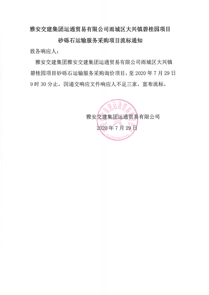 雅安交建集團(tuán)運通貿(mào)易有限公司雨城區(qū)大興鎮(zhèn)碧桂園砂礫石運輸服務(wù)采購項目流標(biāo)通知
