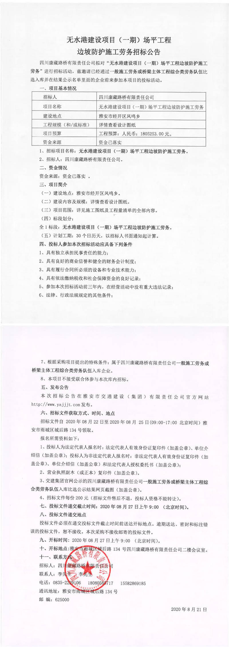 四川康藏路橋有限責(zé)任公司無水港建設(shè)項(xiàng)目(一期)場平工程邊坡防護(hù)施工勞務(wù)招標(biāo)公告