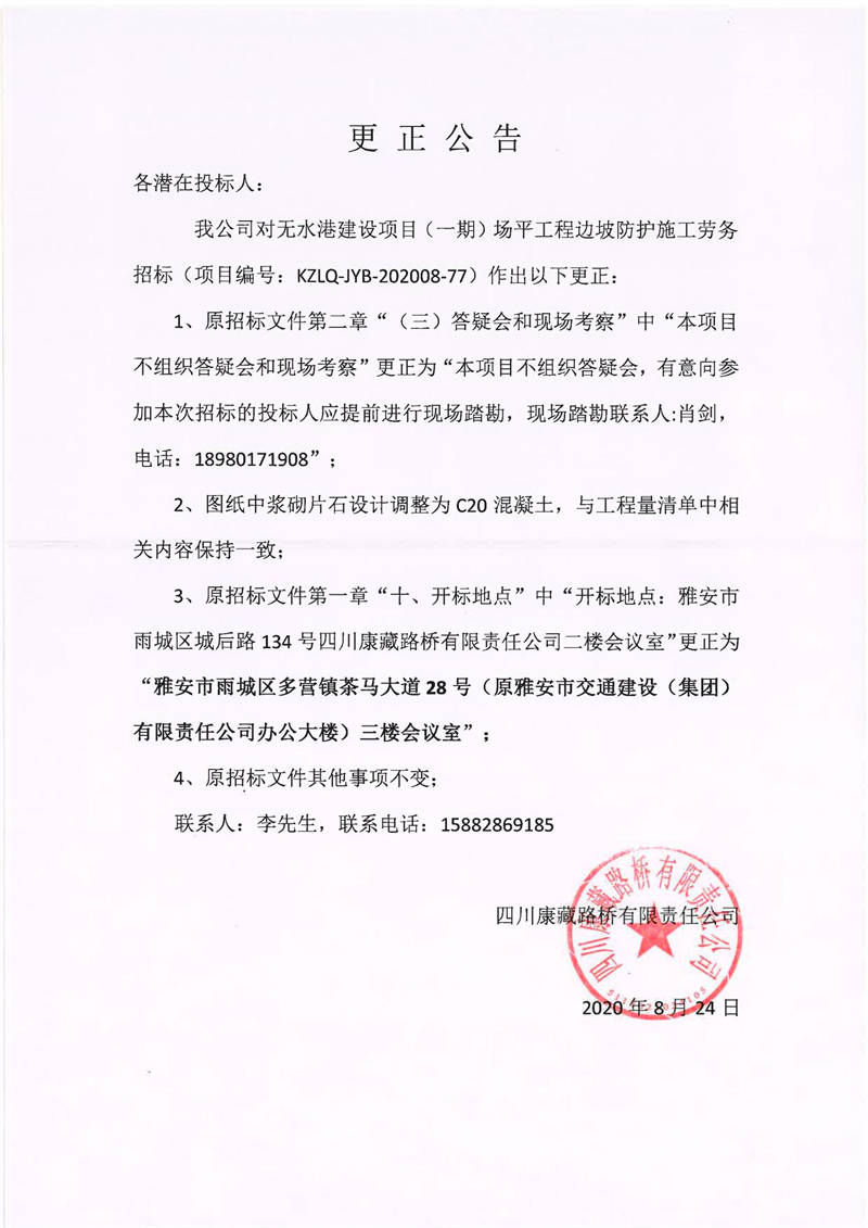 四川康藏路橋有限責任公司無水港建設(shè)項目(一期)場平工程邊坡防護施工勞務(wù)招標更正公告