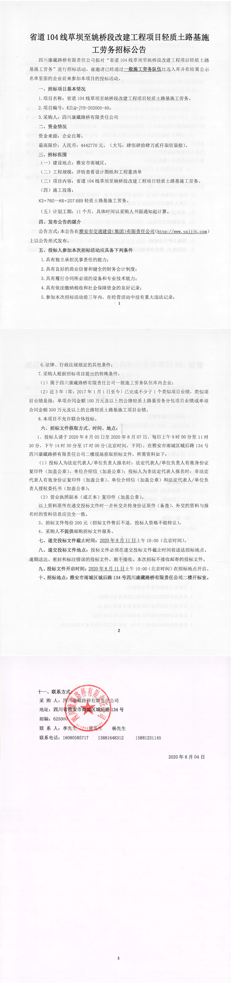 四川康藏路橋有限責(zé)任公司省道104線草壩至姚橋段改建工程項目輕質(zhì)土路基施工勞務(wù)招標(biāo)公告