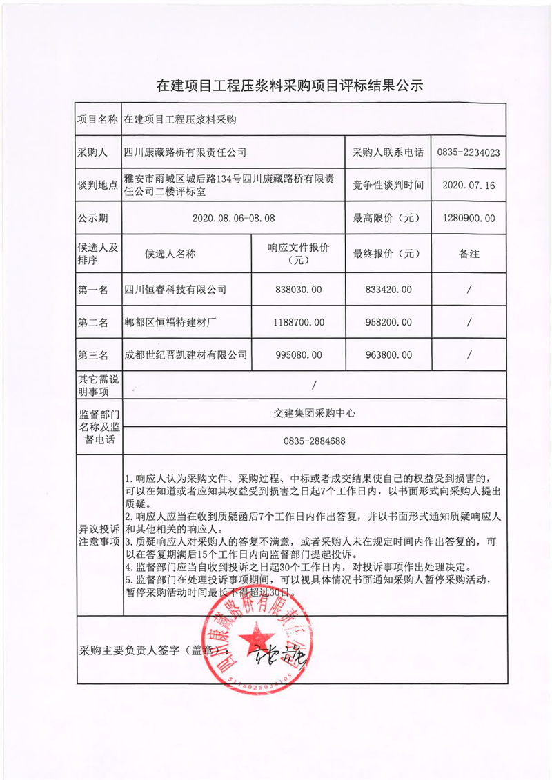 四川康藏路橋有限責(zé)任公司在建項(xiàng)目工程壓漿料采購評標(biāo)結(jié)果公示