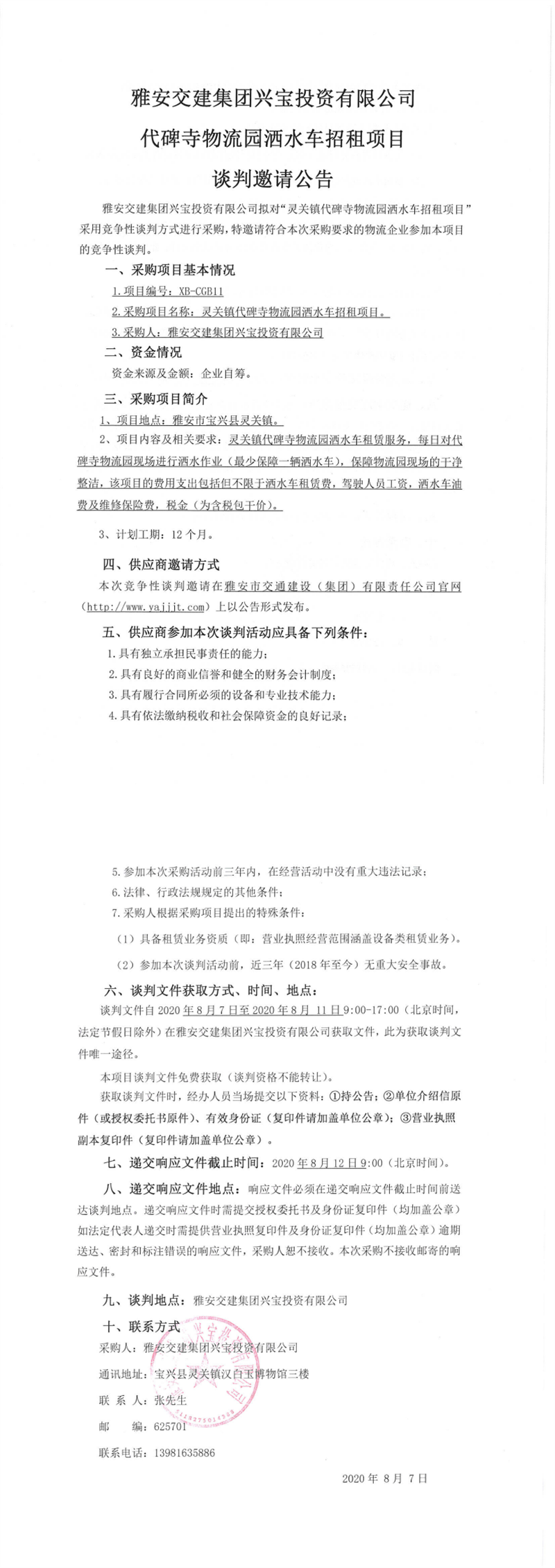 雅安交建集團(tuán)興寶投資有限公司代碑寺物流園灑水車招租項目談判邀請公告