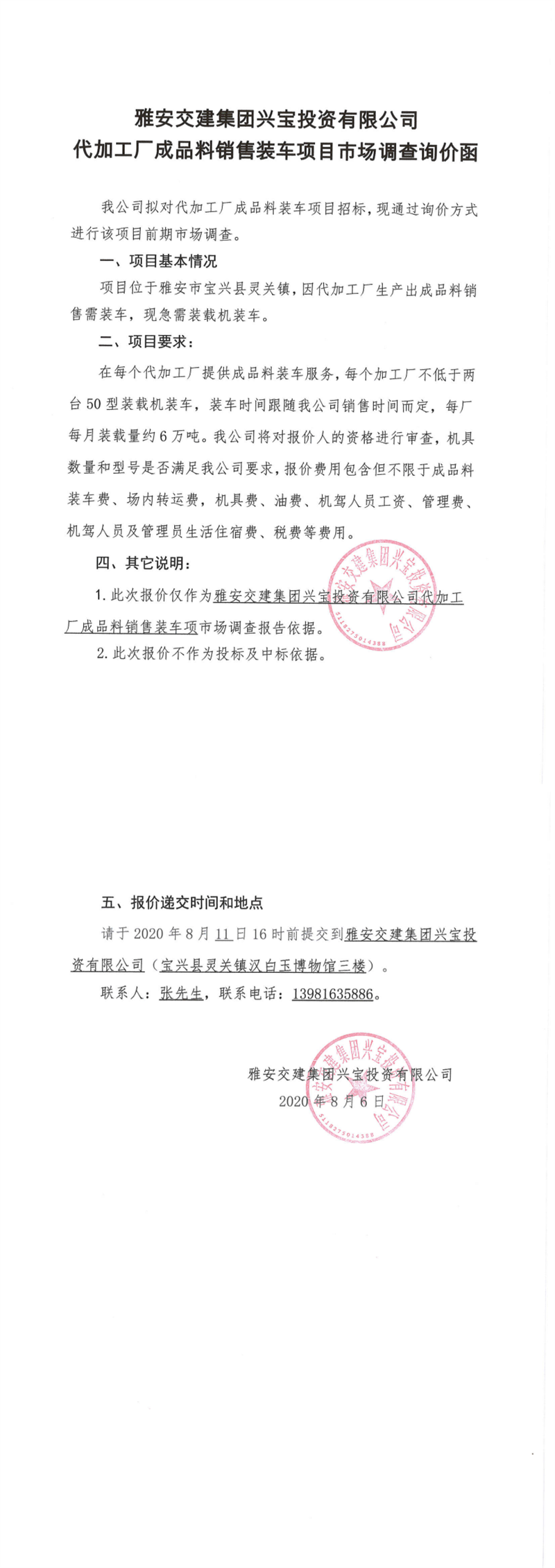 雅安交建集團(tuán)興寶投資有限公司代加工成品料銷售裝車項(xiàng)目市場調(diào)查詢價(jià)函