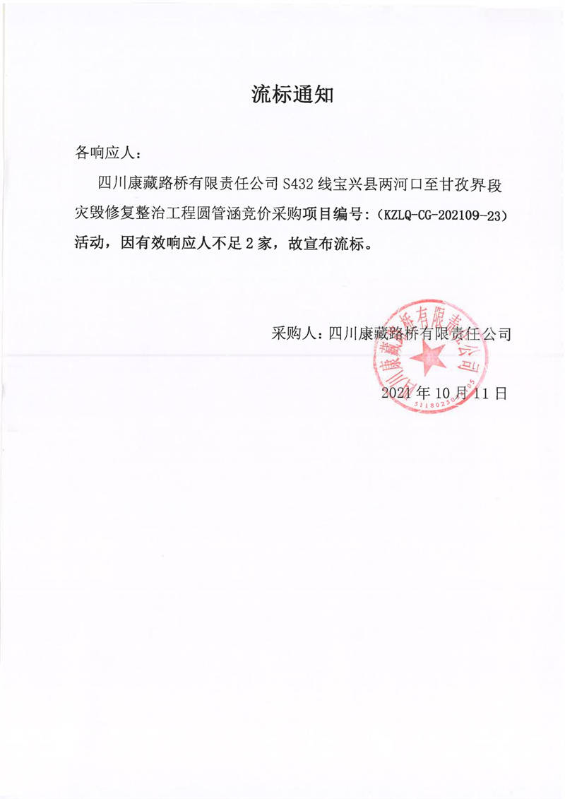 四川康藏路橋有限責(zé)任公司S432線寶興縣兩河口至甘孜界段災(zāi)毀修復(fù)整治工程圓管涵采購競價(jià)流標(biāo)通知