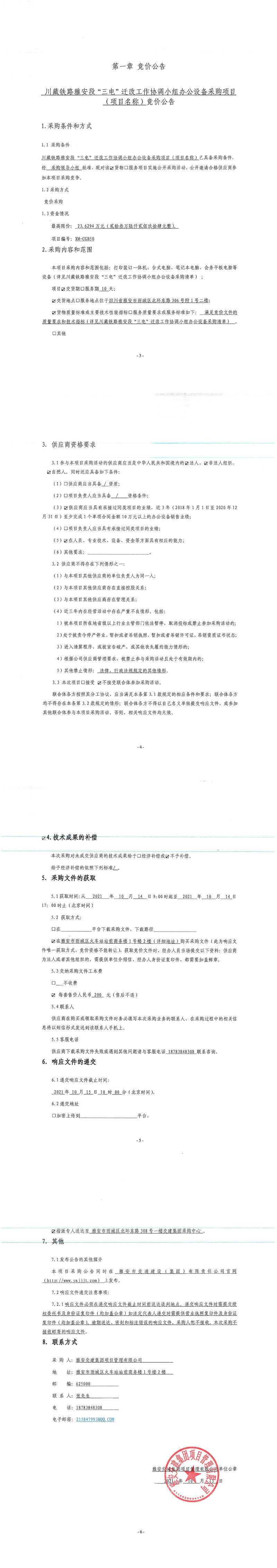 雅安交建集團(tuán)項(xiàng)目管理有限公司川藏鐵路雅安段“三電”遷改工作協(xié)調(diào)小組辦公設(shè)備采購(gòu)項(xiàng)目競(jìng)價(jià)公告