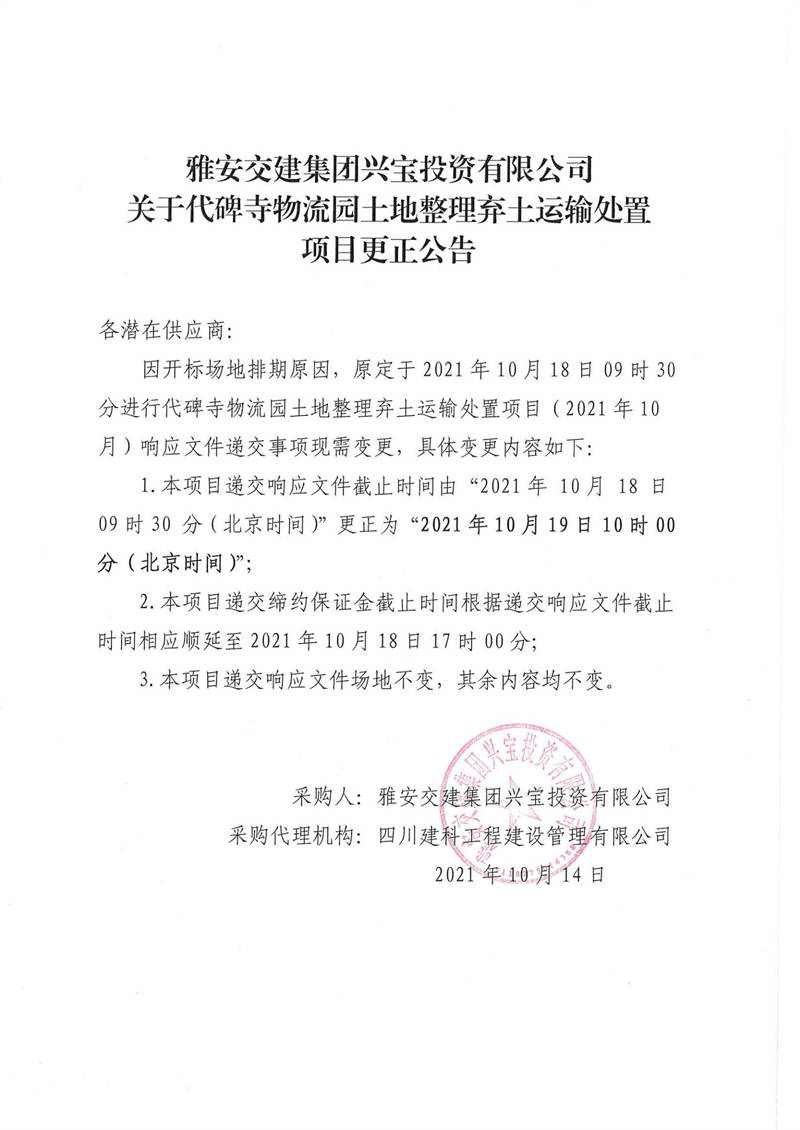 雅安交建集團(tuán)興寶投資有限公司關(guān)于代碑寺物流園土地整理?xiàng)壨吝\(yùn)輸處置項(xiàng)目更正公告