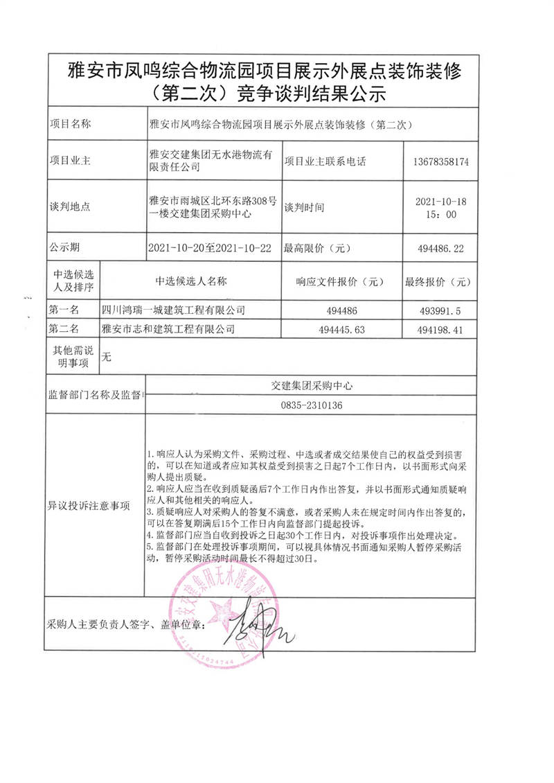 雅安交建集團(tuán)無水港物流有限責(zé)任公司雅安市鳳鳴綜合物流園項目展示外展點裝飾裝修(第二次)競爭談判結(jié)果公示