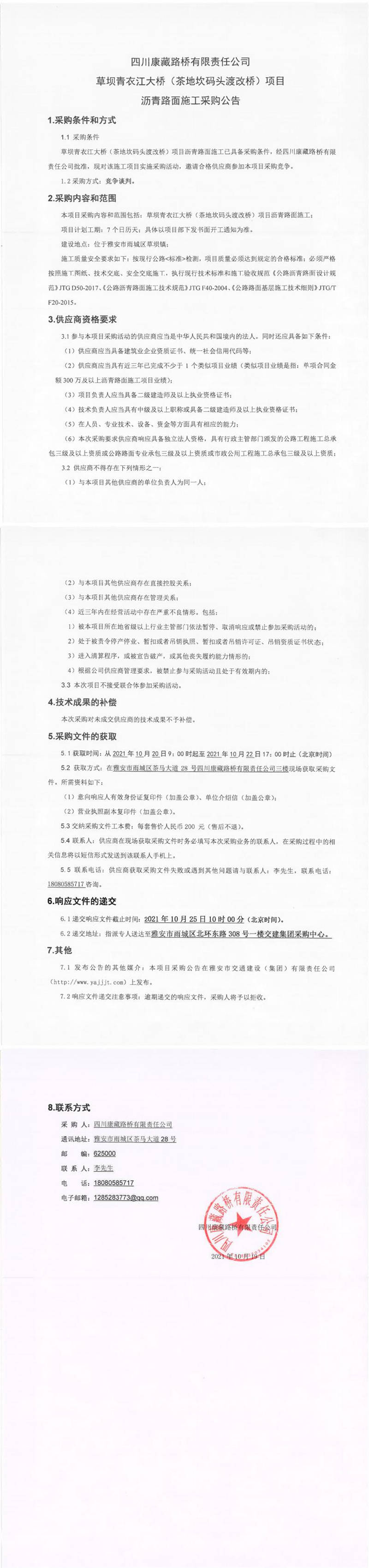 四川康藏路橋有限責任公司草壩青衣江大橋(茶地坎碼頭渡改橋)項目瀝青路面施工采購公告