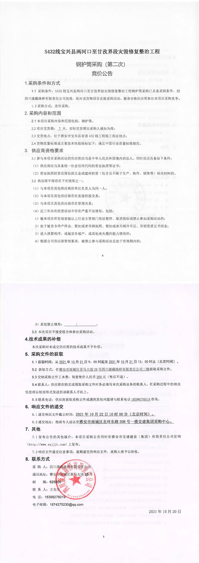 四川康藏路橋有限責(zé)任公司S432線寶興縣兩河口至甘孜界段災(zāi)毀修復(fù)整治工程鋼護筒采購(第二次)競價公告