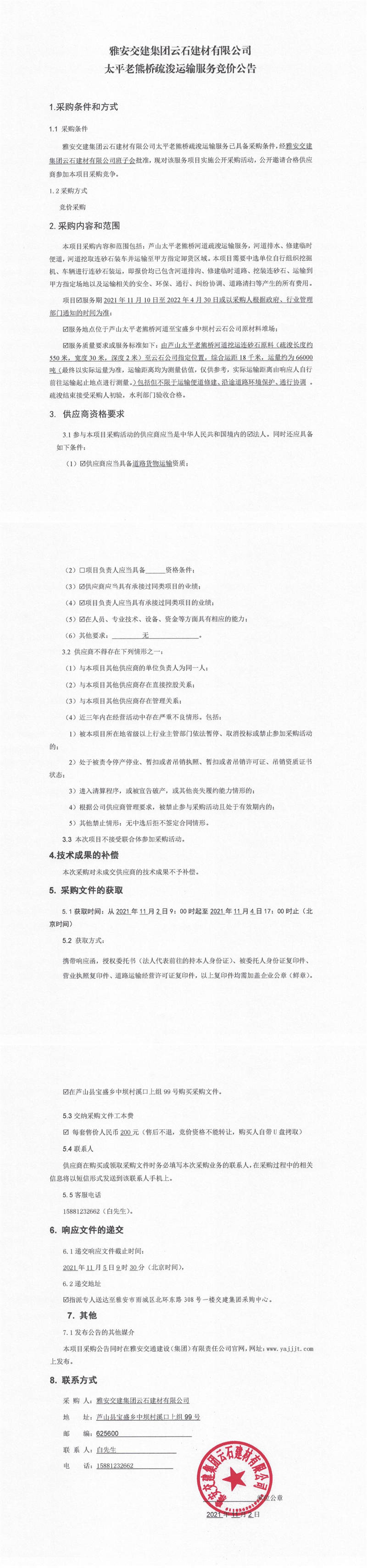 雅安交建集團(tuán)云石建材有限公司太平老熊橋疏浚運輸服務(wù)競價公告