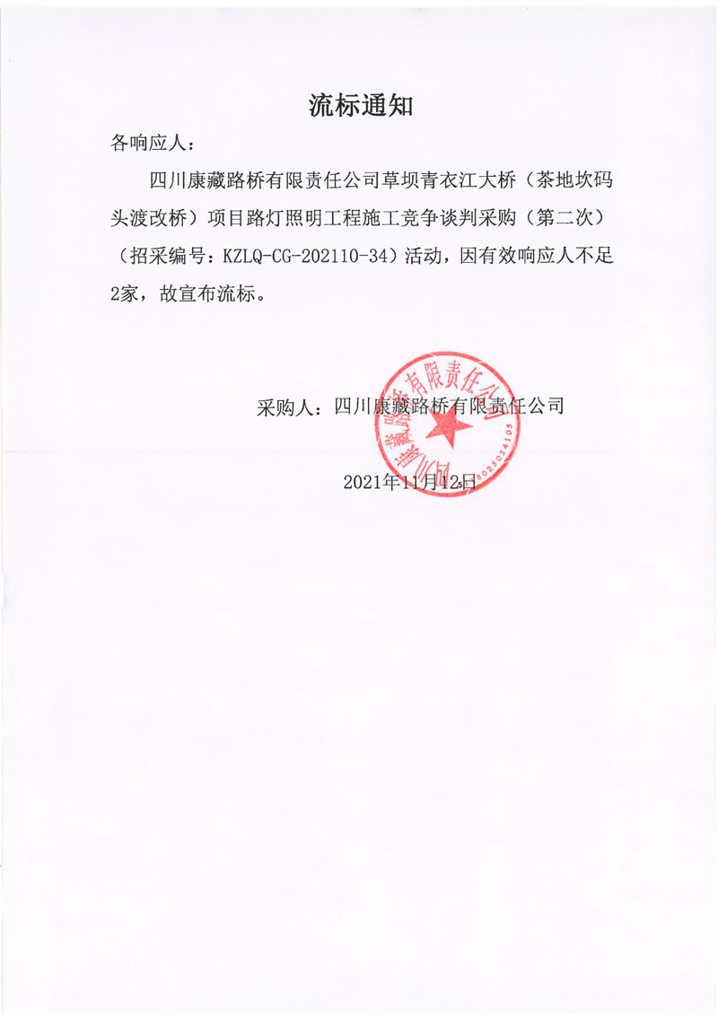 四川康藏路橋有限責任公司草壩青衣江大橋(茶地坎碼頭渡改橋)項目路燈照明工程施工競爭談判采購(第二次)流標通知
