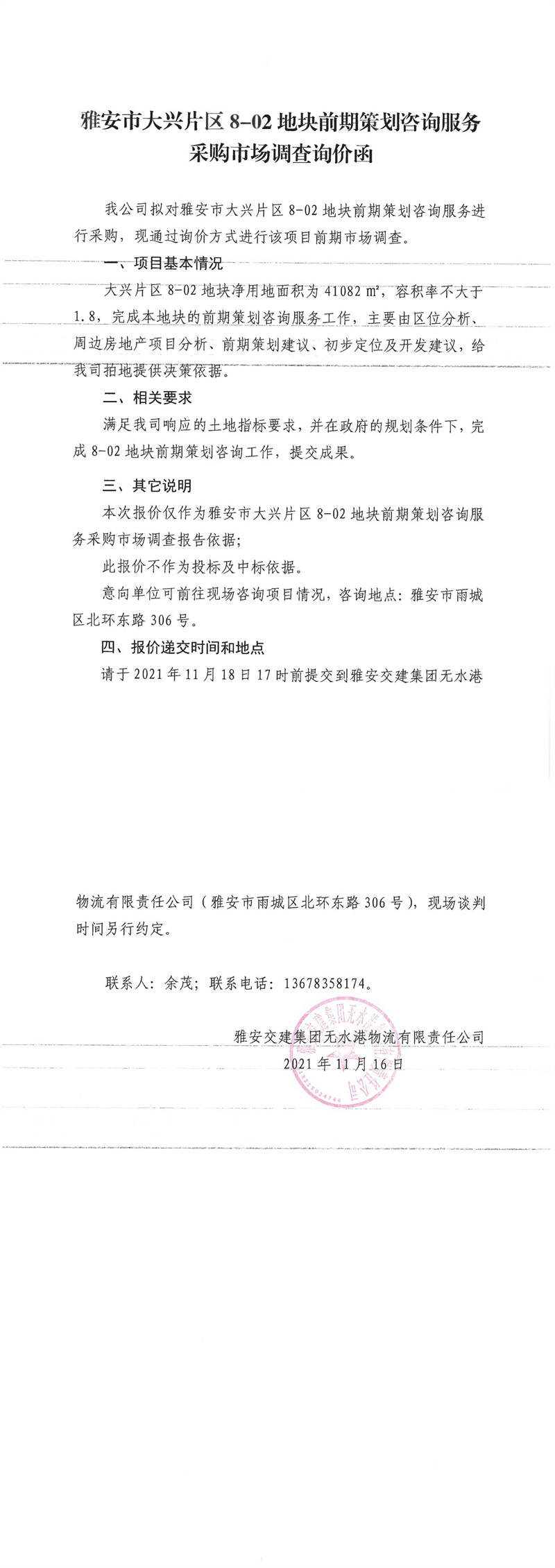 雅安交建集團(tuán)無水港物流有限責(zé)任公司雅安市大興片區(qū)8-02地塊前期策劃咨詢服務(wù)采購市場調(diào)查詢價(jià)函