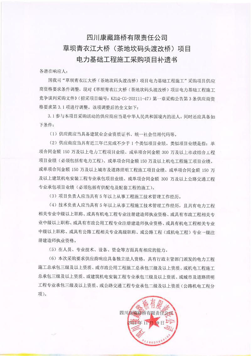 四川康藏路橋有限責(zé)任公司草壩青衣江大橋(茶地坎碼頭渡改橋)項(xiàng)目電力基礎(chǔ)工程施工采購(gòu)項(xiàng)目補(bǔ)遺書(shū)