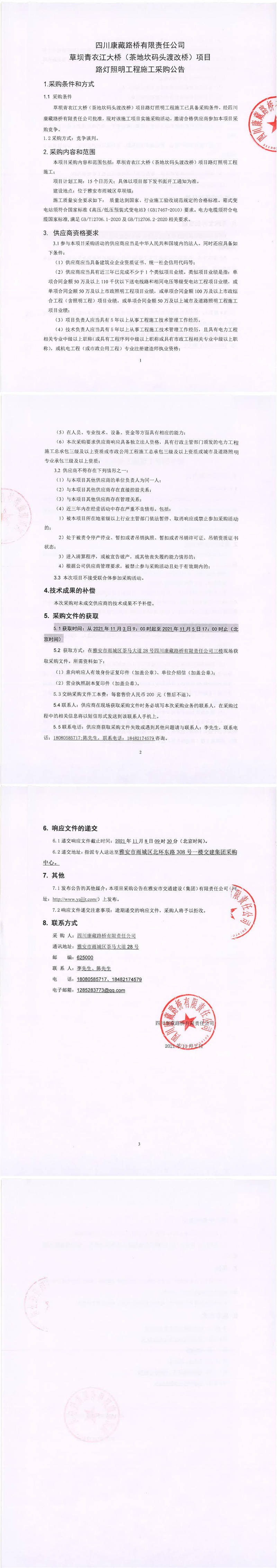 四川康藏路橋有限責(zé)任公司草壩青衣江大橋(茶地坎碼頭渡改橋)項目路燈照明工程施工采購公告
