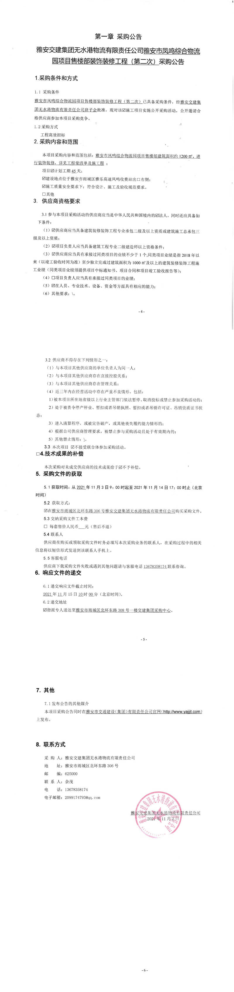 雅安交建集團(tuán)無水港物流有限責(zé)任公司雅安市鳳鳴綜合物流園項目售樓部裝飾裝修工程(第二次)采購公告