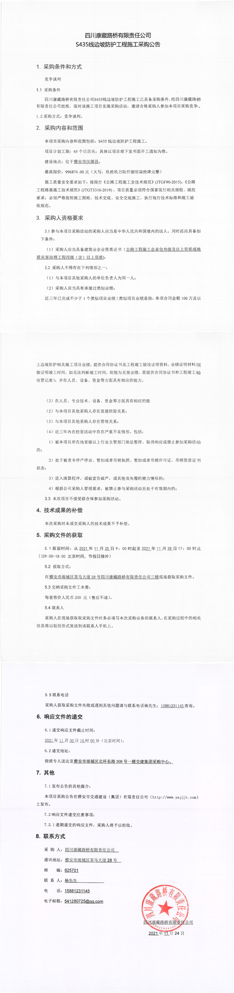 四川康藏路橋有限責(zé)任公司S435線邊坡防護工程施工采購公告