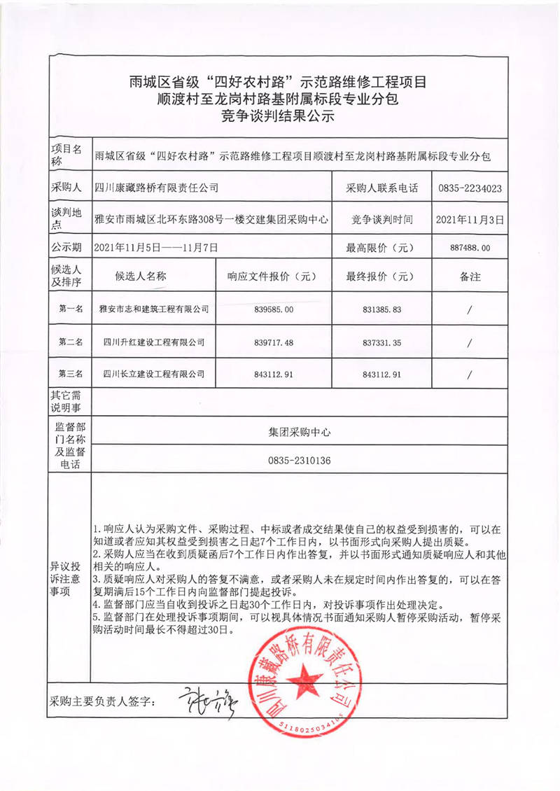 四川康藏路橋有限責(zé)任公司雨城區(qū)省級“四好農(nóng)村路”示范路維修工程項目順渡村至龍崗村路基附屬標(biāo)段專業(yè)分包競爭談判結(jié)果公示