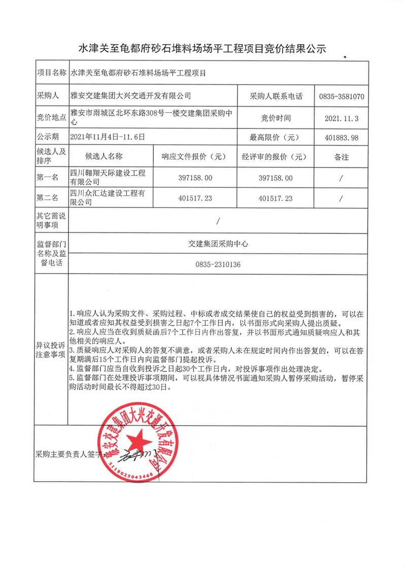 雅安交建集團(tuán)大興交通開(kāi)發(fā)有限公司水津關(guān)至龜都府砂石堆料場(chǎng)場(chǎng)平工程項(xiàng)目競(jìng)價(jià)結(jié)果公示