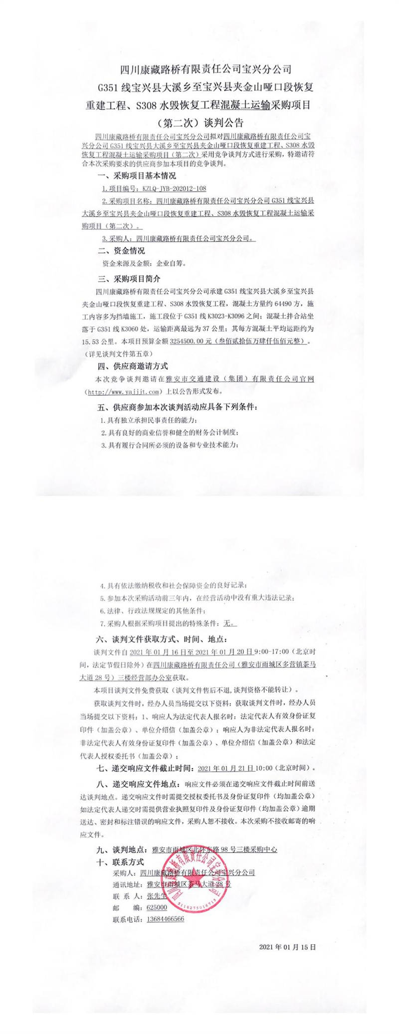 四川康藏路橋有限責(zé)任公司寶興分公司G351線寶興縣大溪鄉(xiāng)至寶興縣夾金山啞口段恢復(fù)重建工程、S308水毀恢復(fù)工程混凝土運(yùn)輸采購項目(第二次)談判公告