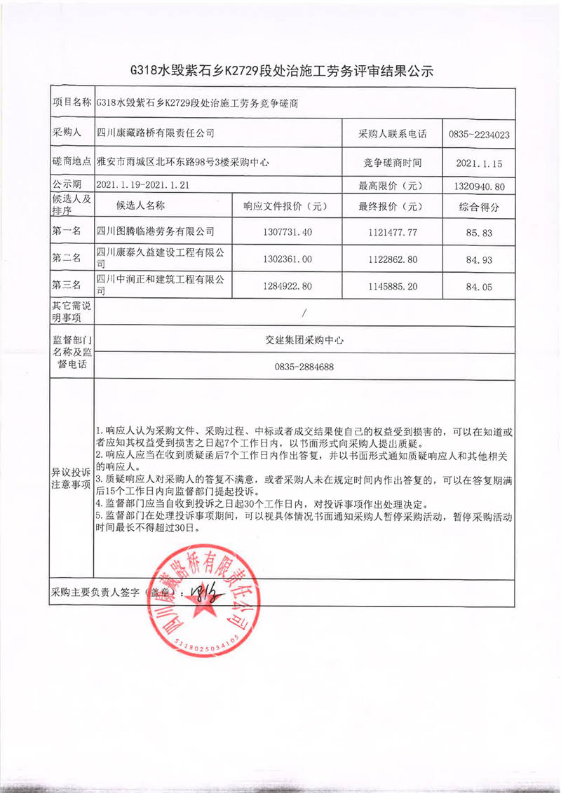 四川康藏路橋有限責任公司G318水毀紫石鄉(xiāng)K2729段處治施工勞務評審結(jié)果公示