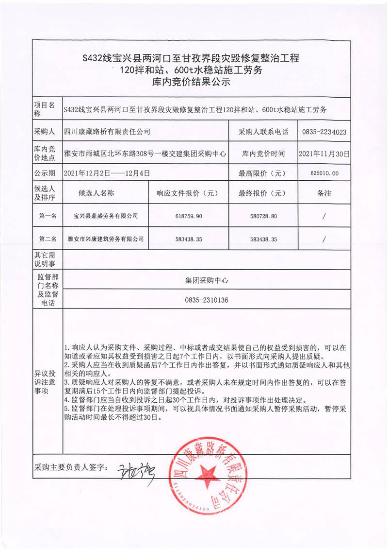 四川康藏路橋有限責(zé)任公司S432線寶興縣兩河口至甘孜界段災(zāi)毀修復(fù)整治工程120拌和站、600t水穩(wěn)站施工勞務(wù)庫內(nèi)競價結(jié)果公示