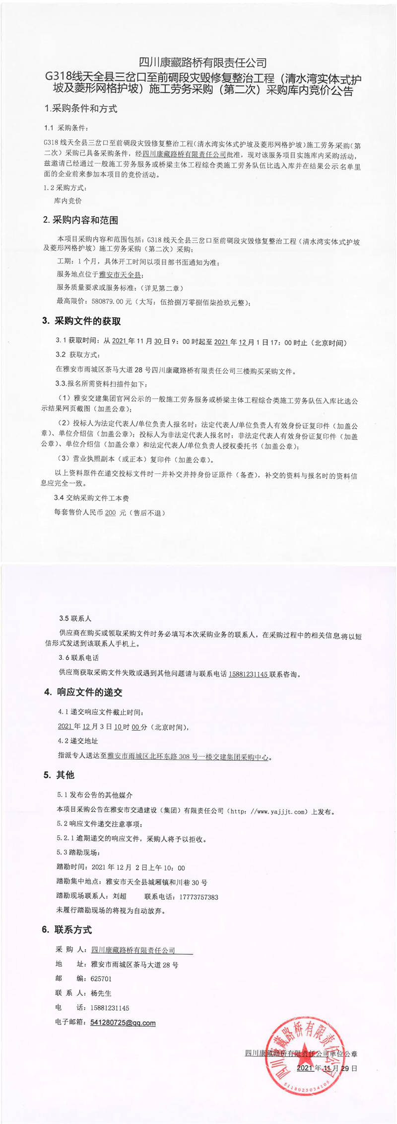 四川康藏路橋有限責(zé)任公司G318線天全縣三岔口至前碉段災(zāi)毀修復(fù)整治工程(清水灣實(shí)體式護(hù)坡及菱形網(wǎng)格護(hù)坡)施工勞務(wù)采購(gòu)(第二次)采購(gòu)庫(kù)內(nèi)競(jìng)價(jià)公告
