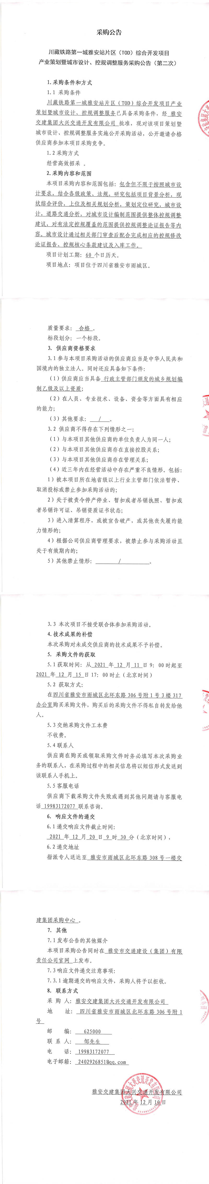 雅安交建集團(tuán)大興交通開發(fā)有限公司川藏鐵路第一城雅安站片區(qū)(TOD)綜合開發(fā)項(xiàng)目產(chǎn)業(yè)策劃暨城市設(shè)計(jì)、控規(guī)調(diào)整服務(wù)采購公告(第二次)