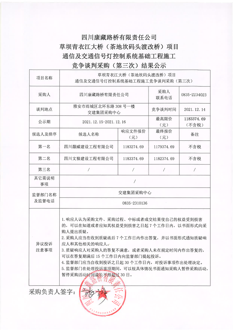 四川康藏路橋有限責(zé)任公司草壩青衣江大橋(茶地坎碼頭渡改橋)項(xiàng)目通信及交通信號燈控制系統(tǒng)基礎(chǔ)工程施工競爭談判采購(第三次)結(jié)果公示