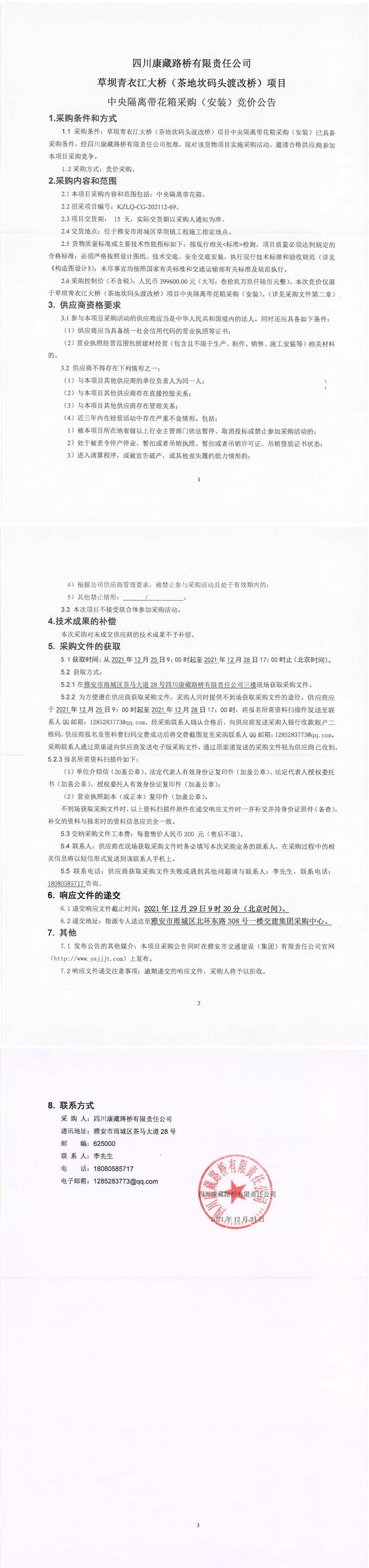 四川康藏路橋有限責(zé)任公司草壩青衣江大橋(茶地坎碼頭渡改橋)項(xiàng)目中央隔離帶花箱采購(安裝)競價公告