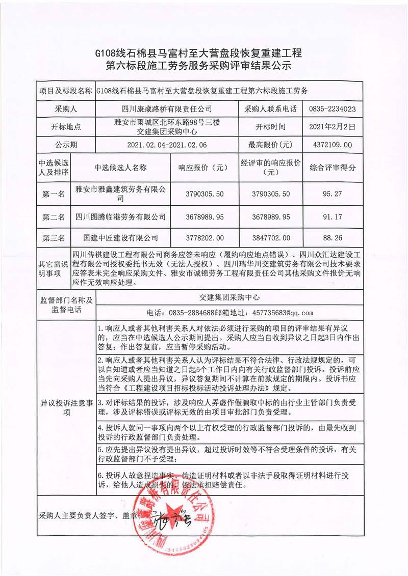 四川康藏路橋有限責(zé)任公司G108線石棉縣馬富村至大營盤段恢復(fù)重建工程第六標(biāo)段施工勞務(wù)服務(wù)采購評審結(jié)果公示