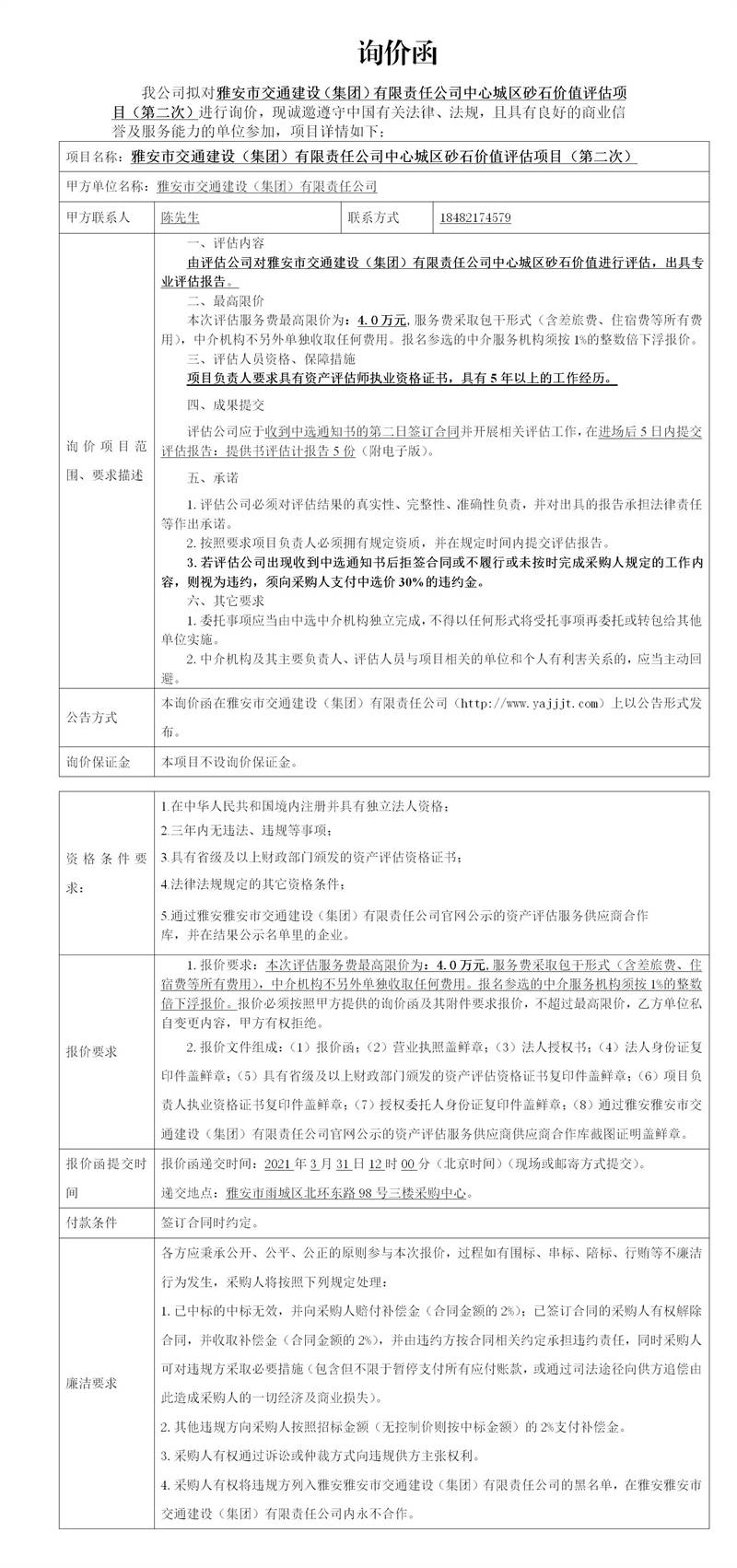 雅安市交通建設(shè)(集團)有限責任公司中心城區(qū)砂石價值評估項目(第二次)詢價函