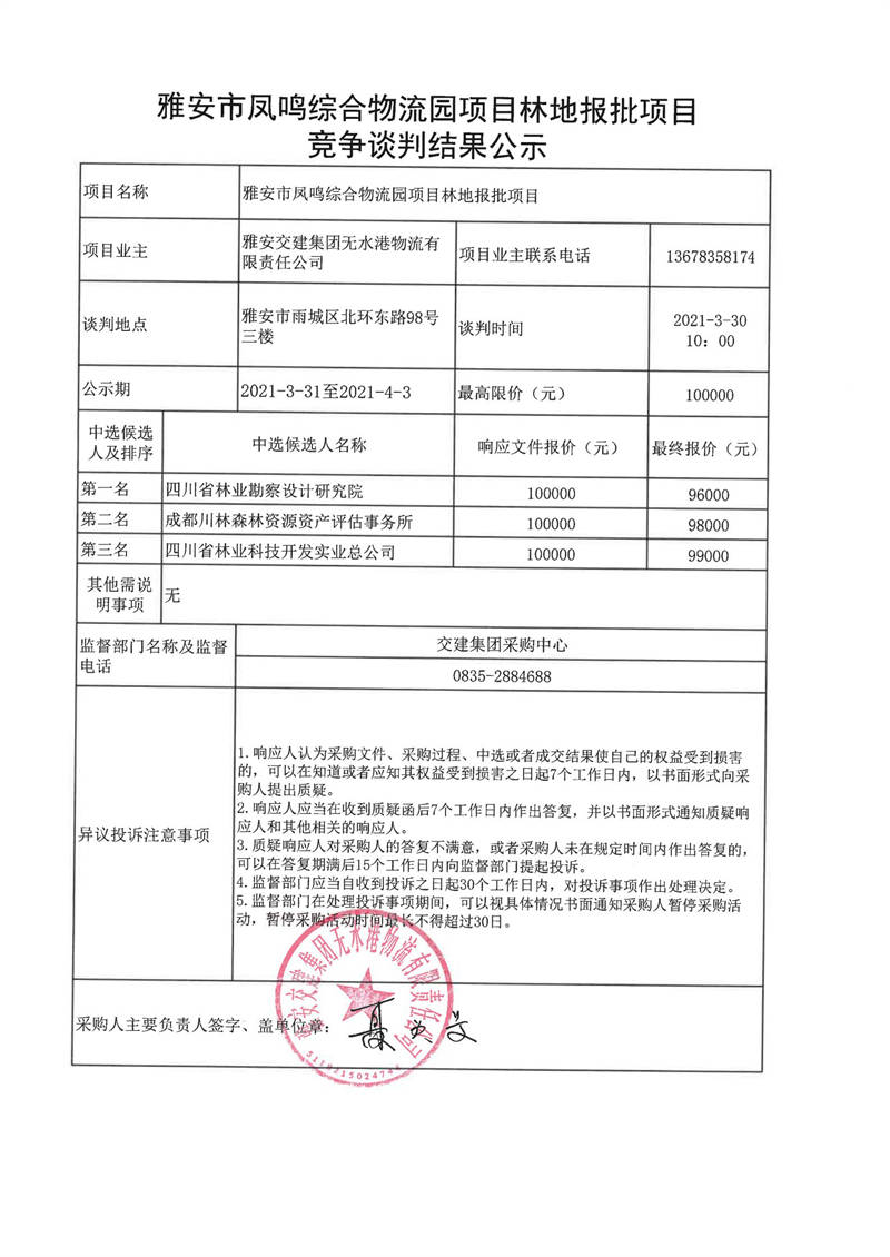 雅安交建集團(tuán)無水港物流有限責(zé)任公司雅安市鳳鳴綜合物流園項(xiàng)目林地報批項(xiàng)目競爭談判結(jié)果公示