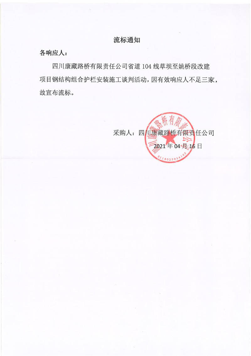 四川康藏路橋有限責任公司省道104線草壩至姚橋段改建項目鋼結(jié)構(gòu)組合護欄安裝施工流標通知