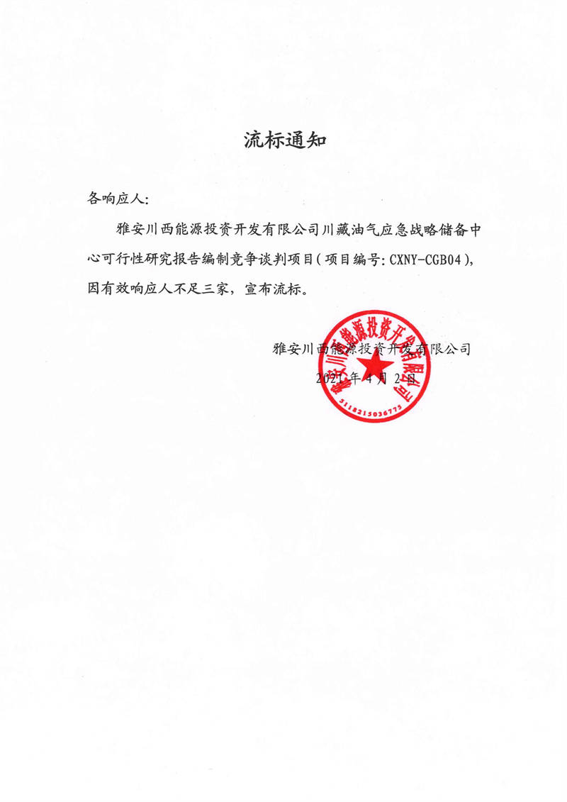 雅安川西能源投資開發(fā)有限公司川藏油氣應(yīng)急戰(zhàn)略儲備中心可行性研究報(bào)告編制競爭談判項(xiàng)目流標(biāo)通知