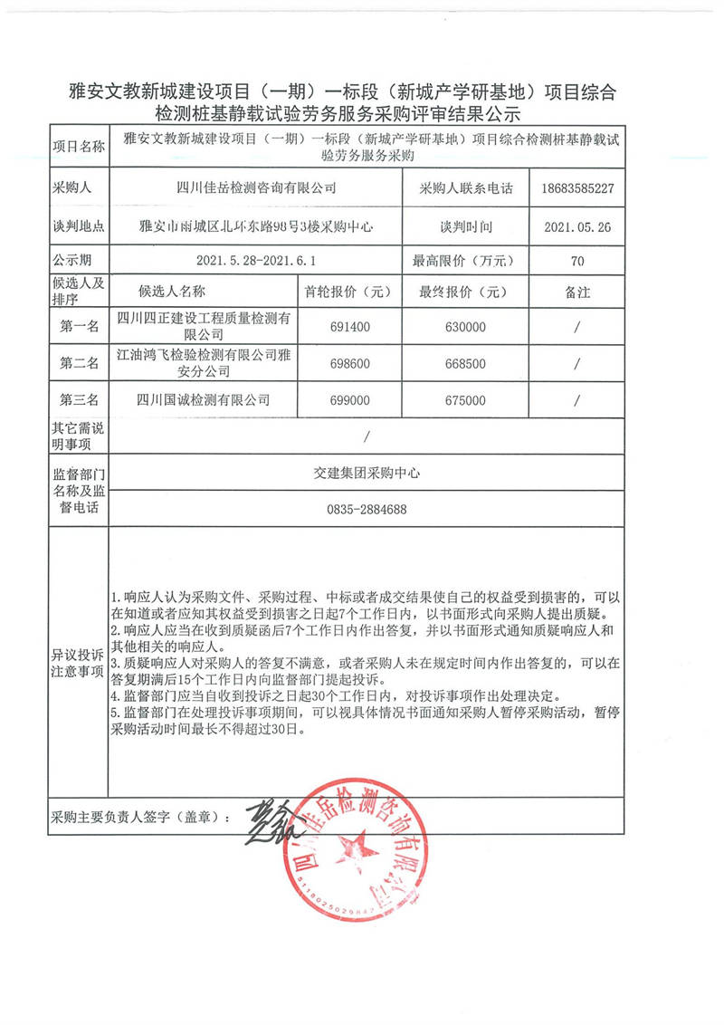 四川佳岳檢測咨詢有限公司雅安文教新城建設(shè)項目(一期)一標(biāo)段(新城產(chǎn)學(xué)研基地)項目綜合檢測樁基靜載試驗勞務(wù)服務(wù)采購評審結(jié)果公示