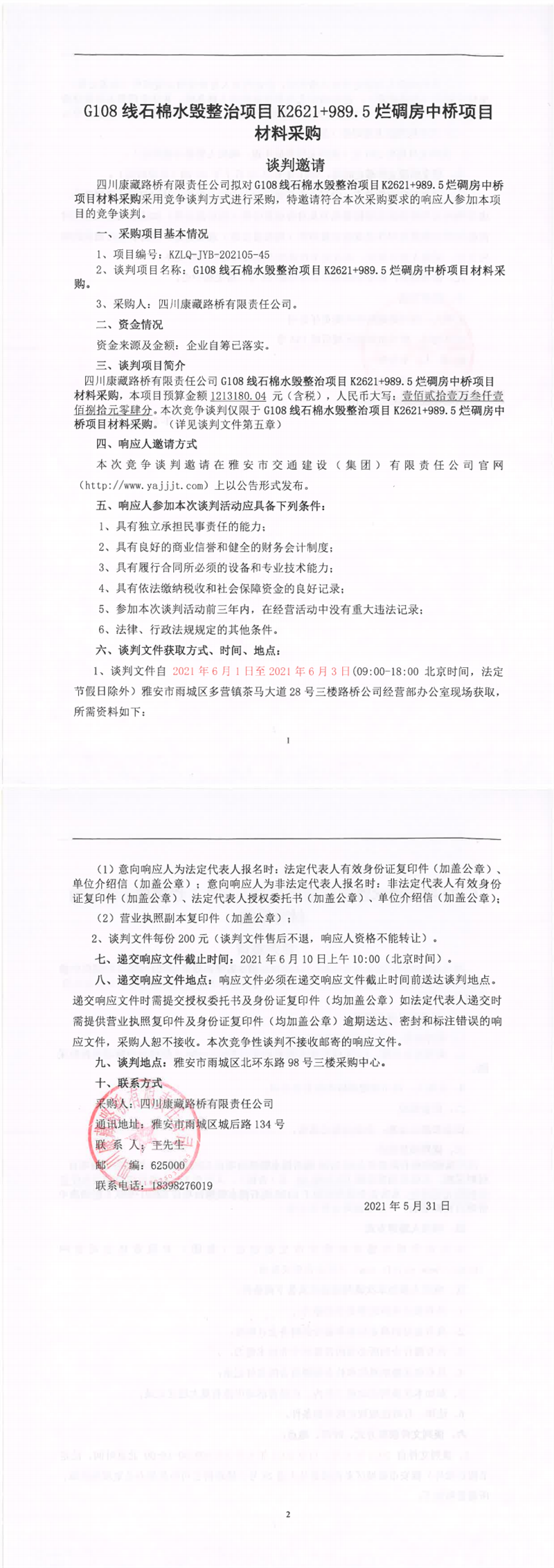 四川康藏路橋有限責(zé)任公司G108線石棉水毀整治項目K2621+989.5爛碉房中橋項目材料采購競爭談判公告