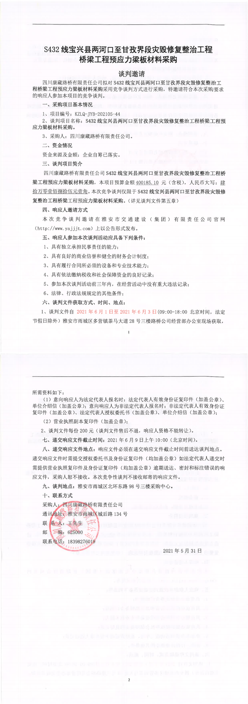 四川康藏路橋有限責(zé)任公司G108線石棉水毀整治項目K2621+989.5爛碉房中橋項目材料采購競爭談判公告