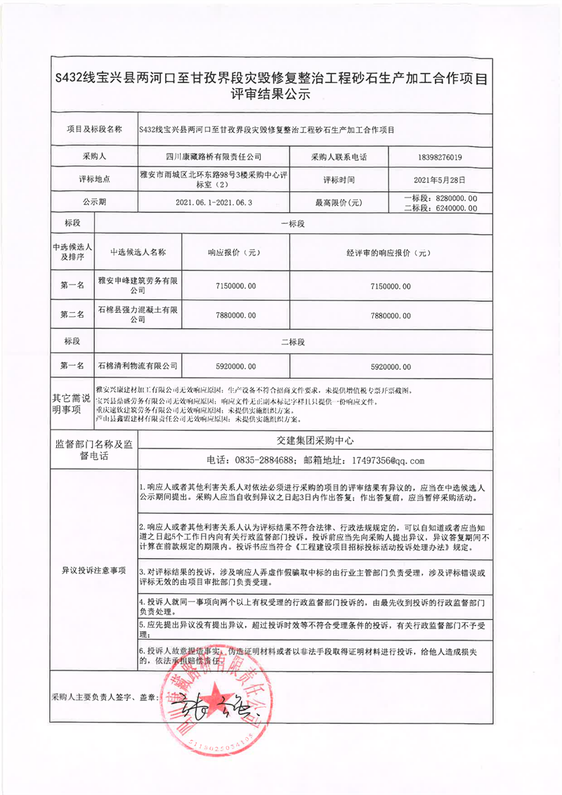 四川康藏路橋有限責(zé)任公司S432線(xiàn)寶興縣兩河口至甘孜界段災(zāi)毀修復(fù)整治工程砂石生產(chǎn)加工合作項(xiàng)目評(píng)審結(jié)果公示