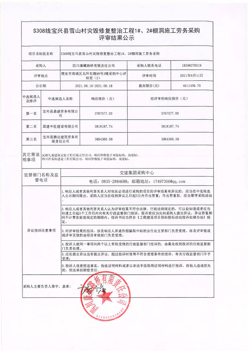 四川康藏路橋有限責任公司S308線寶興縣雪山村災毀修復整治工程1#、2#棚洞施工勞務(wù)采購評審結(jié)果公示