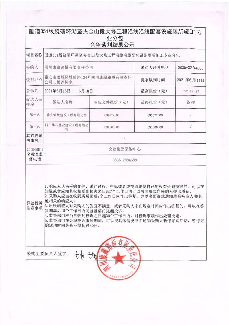 四川康藏路橋有限責(zé)任公司國道351線蹺磧環(huán)湖至夾金山段大修工程沿線沿線配套設(shè)施廁所施工專業(yè)分包競爭談判結(jié)果公示