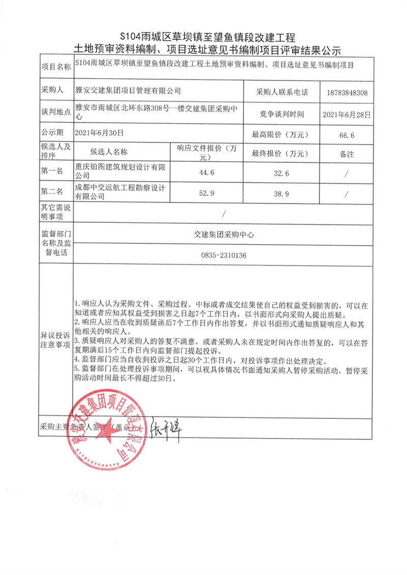 雅安交建集團(tuán)項(xiàng)目管理有限公司S104雨城區(qū)草壩鎮(zhèn)至望魚鎮(zhèn)段改建工程土地預(yù)審資料編制、項(xiàng)目選址意見書編制項(xiàng)目評(píng)審結(jié)果公示